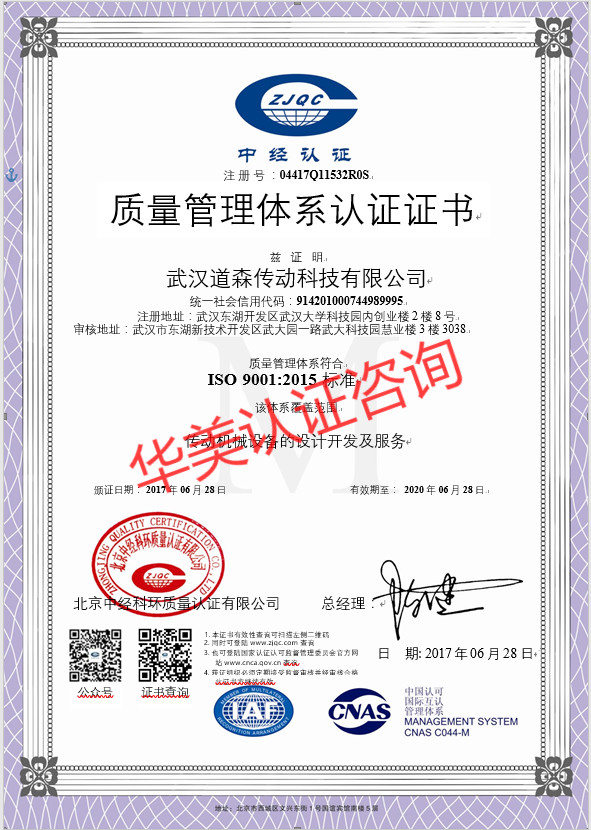 2017年武漢道森傳動科技有限公司與武漢華美認證咨詢有限公司合作開展了ISO9001質(zhì)量管理體系認證,并順利取得了ISO9001質(zhì)量管理體系認證證書。